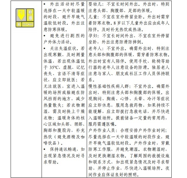 五、分級防護措施指南 針對寒潮預警信號等級,我們提出分級人群防護措施建議。