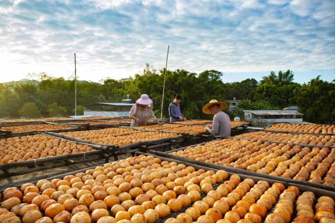 在廣東省梅州市平遠縣石正鎮中東村,村民正趁晴好天氣曬制柿餅。平遠縣供銷總公司通過合作社與農戶簽訂收購合約,使石正柿花成為當地農民增收致富的特色產業。馮錫權攝(影像中國)