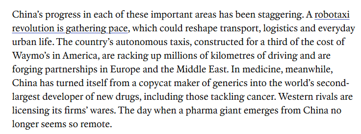 文章分析指出,中國在這兩個重要領域的進展令人矚目。自動駕駛出租車革命正在加速發展,這可能會重塑交通運輸、物流和城市的日常生活。中國的自動駕駛出租車造價僅為美國的三分之一,行駛里程已達數百萬公里,并在歐洲和中東地區建立了合作關系。與此同時,在醫藥領域,中國已從仿制藥生產國轉變為全球第二大新藥研發國。