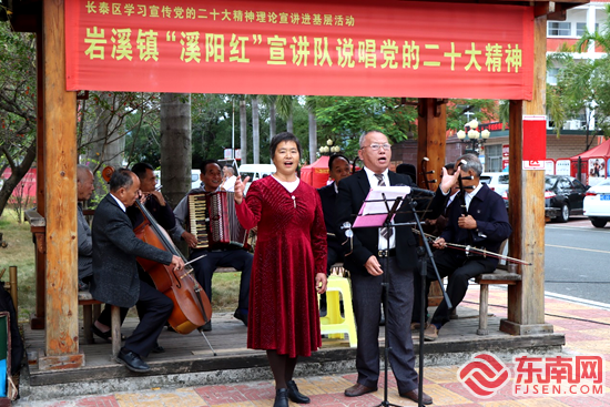 “共產黨為人民,得民心,二十大描繪美好的前程……”長泰區珪后村鄉村公園里,一支由村里老人組成的“溪陽紅”宣講隊格外引人注目,他們把黨的二十大報告金句串聯起來,用閩南方言以說唱的形式向村里群眾宣講,濃濃的鄉音格外接地氣,圍觀群眾紛紛叫好。 黨的二十大閉幕后,漳州市長泰區迅速從各地各單位抽調骨干,成立11支理論宣講小分隊。11月2日上午,長泰區在巖溪鎮珪后村啟動“學習宣傳黨的二十大精神理論宣講進基層活動”,區委常委、宣傳部部長陳貴芬向全區9個鄉鎮(場、區、辦事處)、區直機關黨工委、教育局組成的宣講小分隊授旗。區委黨校教師作了題為《團結奮發繪宏圖 百年圓夢譜新篇——深入學習貫徹中國共產黨第二十次全國代表大會精神》專題輔導報告。