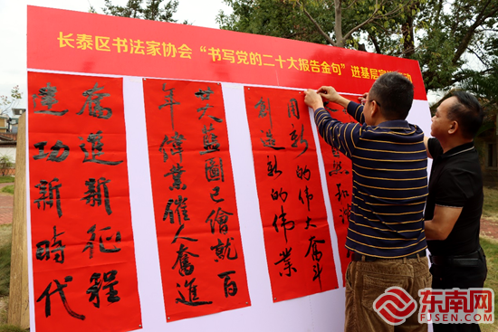 妙筆寫金句,紅心永向黨。當天上午,在巖溪鎮珪后村,長泰區書法協會和燈謎協會還聯合舉辦“宣傳貫徹黨的二十大精神”主題書法展示和燈謎競猜等活動,吸引不少群眾積極參或駐足觀看,現場氣氛熱烈。“今天我們村通過書法展覽、紅歌會、猜燈謎等形式組織大家一起學習黨的二十大的精神,我覺得很接地氣,也很有趣。”參加活動的群眾高興地表示。(泰融 文/圖) |