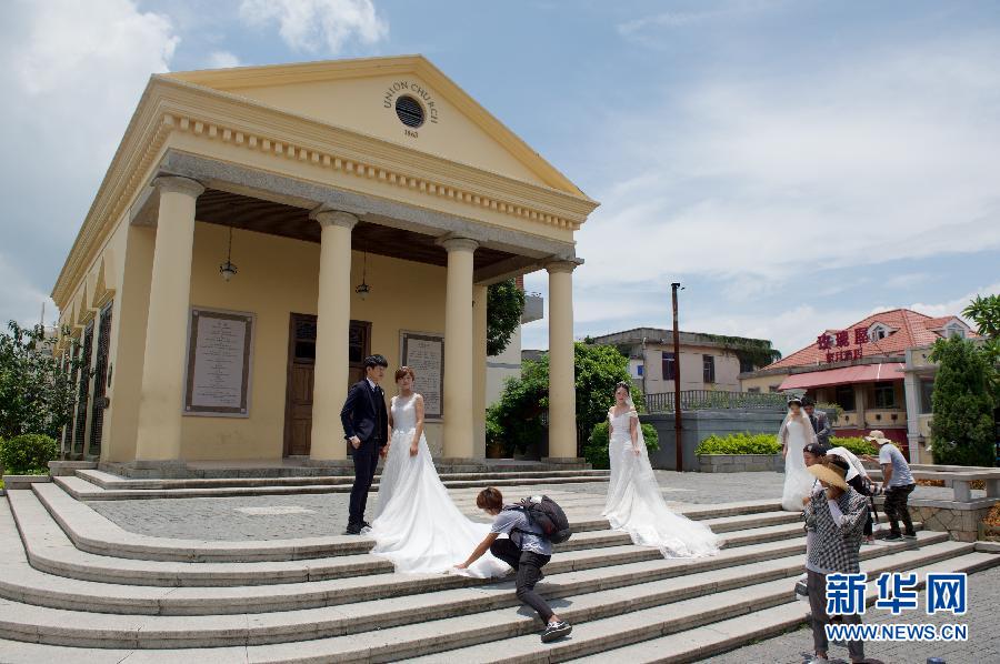 鼓浪嶼代表性歷史建筑協(xié)和禮拜堂前幾對情侶在拍攝婚紗照。新華社記者姜克紅攝 “鼓浪嶼:歷史國際社區(qū)”是中國一處獨特的、見證了中國在全球化發(fā)展早期階段實現(xiàn)現(xiàn)代化和中外多元文化交流與融合歷程的活態(tài)文化遺產(chǎn),反映出中國傳統(tǒng)文化深厚而堅韌的文化根基和對世界不同文化、價值觀的包容、吸納與發(fā)展。