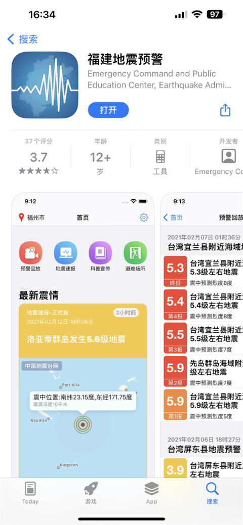 “福建地震預(yù)警”客戶端下載頁。來源:應(yīng)用商店 “雙端”覆蓋線上線下 實現(xiàn)“科普+預(yù)警” 2018年,由福建省地震局自主研發(fā)的“福建地震預(yù)警”客戶端正式上線,利用高效可靠的消息傳遞機(jī)制,實時接收福建省地震局推送的閩臺地區(qū)地震預(yù)警和全球地震速報信息,同時還提供地震科普和避難場所查詢等功能,目前可在福建省地震局官網(wǎng)和各大移動端應(yīng)用商店下載。 在省內(nèi)各大公共場所,特別是中小學(xué)校,福建省已布設(shè)了1.8萬余臺地震預(yù)警信息發(fā)布終端,利用電子屏與顯示燈告知地震相關(guān)信息?!敖K端上有4種顏色的顯示燈,紅橙黃藍(lán)四色表示不同的地震強(qiáng)度和危害程度,更加直觀醒目。”李軍解釋。 “根據(jù)當(dāng)前的定位,客戶端與終端不僅能夠告知地震信息,還能夠預(yù)估破壞程度,以便及時采取必要的措施?!崩钴娊榻B,“在沒有地震發(fā)生的時候,我們利用客戶端和終端對地震知識進(jìn)行科普宣傳。”此外,省地震局未來還將進(jìn)一步開放數(shù)據(jù)接口,為更多的人提供地震預(yù)警和科普服務(wù)。