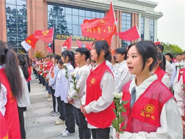 千余名學生和志愿者參加悼念活動 上午9時,文林山革命英烈紀念園內,手持白花的參與者整齊列隊,表情莊嚴肅穆。“當亦樂犧牲吾身與汝身之福利,為天下人謀永福也!”“就讓你們的槍聲,成為我們婚禮的禮炮吧!”“憑將一掬丹心在,泉下差堪對我翁。”……活動開始,來自福州大學至誠學院人文藝術系的同學們身著表演服,在紀念碑前的臺階上進行沉浸式角色扮演。他們先后朗誦林覺民《與妻書》片段、徐琛和余哲貞烈士犧牲前留言以及吳石將軍的絕命詩等先烈經典名言和詩句。 飽滿的激情和抑揚頓挫的語調,點燃了全場熱情,在場1000多名參與者一起跟誦,通過革命先烈的名言,追憶他們的豐功偉績。鏗鏘有力、飽含深情的話語聲,回蕩在文林山的松林間。
