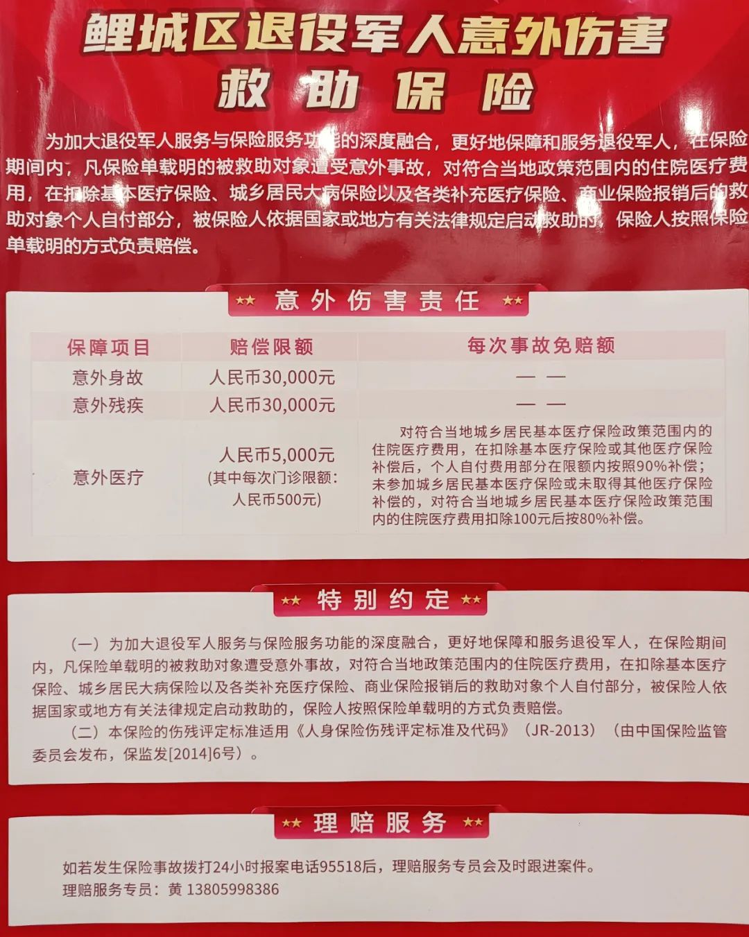 為提升鯉城區(qū)退役軍人意外傷害救助保險項目的服務質(zhì)效,儀式上,人保財險鯉城支公司組織鯉城區(qū)退役軍人服務中心及各街道退役軍人服務站負責人、公司項目骨干,針對保險責任方案、理賠釋義及服務進行業(yè)務培訓。接下來,將通過覆蓋鯉城區(qū)退役軍人服務站的科普e站、微信公眾號、門型展架及宣傳彩頁等媒介進行政策宣傳,進一步提高廣大退役軍人的知曉度和辦理滿意率。 作為鯉城區(qū)2023年為民辦實事項目的第二十四件實事,退役軍人意外傷害救助保險保費每人每年30元,鯉城區(qū)每年共投入30萬元。人身意外傷害保險項目涵蓋意外身故、意外殘疾、意外醫(yī)療3類。退役軍人出現(xiàn)意外傷害時,可到縣級以上醫(yī)院門診、住院治療,按流程申請理賠,按照不同類型可以申請到5000-30000元的賠償金額。