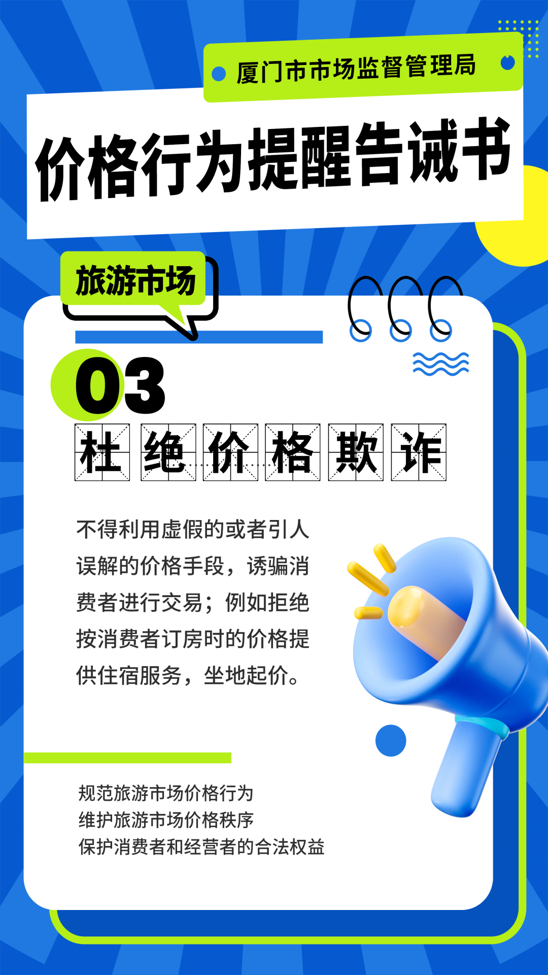 參會酒店、民宿協(xié)會和平臺經(jīng)營者也介紹了近期客房預(yù)訂及價格情況,各連鎖酒店假日期間客房價格受供求關(guān)系影響有較高幅度上漲,但均能落實明碼標(biāo)價、誠信經(jīng)營,平臺企業(yè)也表示將落實主體責(zé)任,持續(xù)關(guān)注線上酒店客房價格形勢,及時啟動預(yù)警機制,保護好消費者權(quán)益。 現(xiàn)場,參會主體現(xiàn)場簽署價格行為合規(guī)承諾書,向社會公開承諾嚴(yán)格守法經(jīng)營,做到明碼標(biāo)價、誠信經(jīng)營,合理定價,共同維護好廈門市旅游市場價格秩序。 下一步,市市場監(jiān)管局將進一步加大旅游市場價格監(jiān)督檢查力度,節(jié)日期間持續(xù)關(guān)注旅游市場價格形勢和投訴舉報情況,安排力量增加檢查頻次,嚴(yán)肅查處各類價格違法行為,及時查處和曝光情節(jié)嚴(yán)重、性質(zhì)惡劣的典型案例,營造良好旅游消費環(huán)境。 |