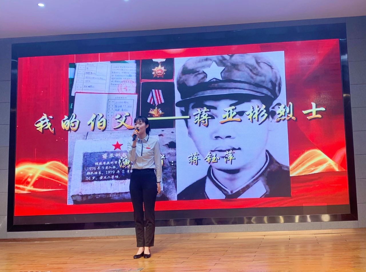 宣講活動由福建省“烈士親友講烈士故事”巡回宣講團成員、鯉城籍烈士蔣亞彬的侄女蔣鈺萍,飽含深情地講述了《我的伯父——蔣亞彬烈士》。44年前一個風華正茂的熱血青年,為了國家和民族的利益,不顧個人安危,英勇作戰,身負重傷仍堅守陣地,勝利完成任務卻獻出年輕的生命,從此長眠在了祖國的南疆。宣講員蔣鈺萍用鏗鏘的話語講述蔣亞彬烈士在對敵作戰中英勇頑強和不畏犧牲的精神,講述他帶給親人帶給后人的榜樣力量。