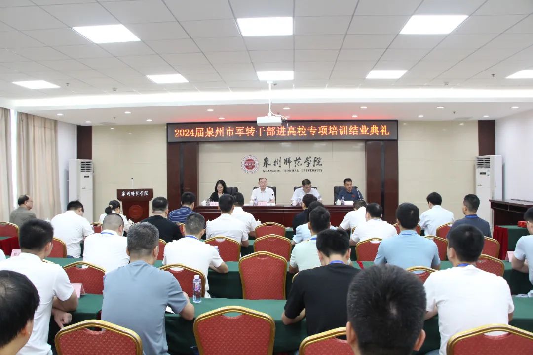 6月28日上午,2024屆泉州市軍轉干部進高校專項培訓結業典禮在泉州師范學院舉行,25名軍轉干部完成為期一學年的專項培訓活動,學員代表領取結業證書,優秀學員領取榮譽證書。 中共泉州市委退役軍人事務工作領導小組辦公室主任、泉州市退役軍人事務局局長唐良元,泉州市退役軍人事務局副局長劉紅生,泉州師范學院黨委常委、副校長夏侯建兵,泉州師范學院武裝部、教務處、后勤管理處、繼續教育處、繼續教育學院等相關部門負責人,泉州市退役軍人事務局相關科室負責人等參加結業典禮。 “通過一年的學習,各位學員能夠主動轉變角色,把軍人的優良作風帶進校園、融入到學習中,在政治思想、專業素質和崗位能力等方面得到了加強和提升。”泉州師范學院黨委常委、副校長夏侯建兵在致辭中表示,希望學員要堅持學習,通過不斷學習努力增強本領;要實干篤行,在地方履職中建功立業;同時,也希望學員共同關心母校,一如既往支持母校發展。