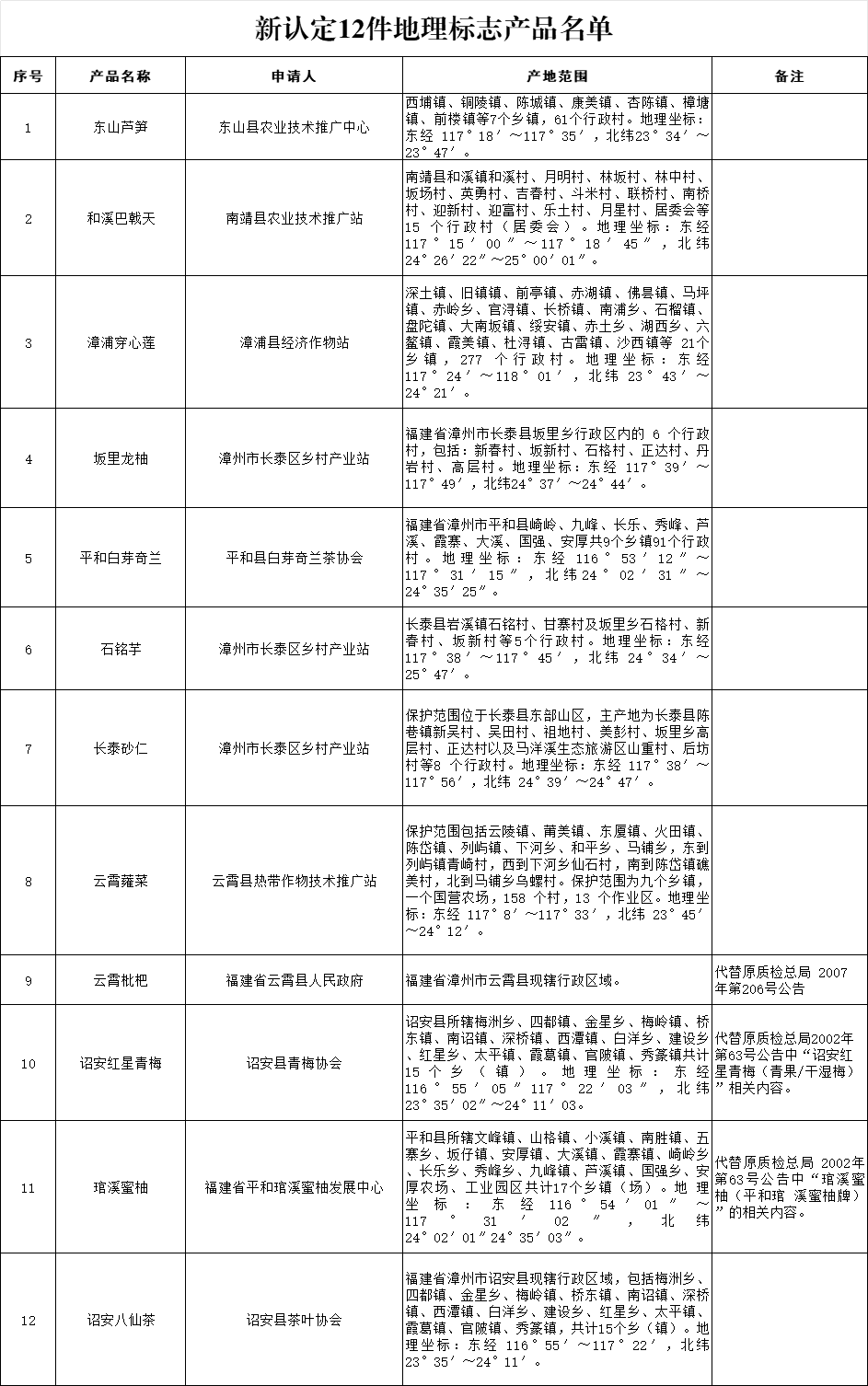 轉(zhuǎn)換認(rèn)定過程中,相關(guān)產(chǎn)品產(chǎn)地市場監(jiān)管部門與農(nóng)業(yè)農(nóng)村部門充分協(xié)作,聯(lián)合業(yè)內(nèi)專家,全面、科學(xué)地梳理了保護(hù)要求,有力推動了農(nóng)產(chǎn)品地理標(biāo)志向地理標(biāo)志產(chǎn)品轉(zhuǎn)換認(rèn)定工作落實(shí)。 此次公告認(rèn)定的12件地理標(biāo)志產(chǎn)品涵蓋東山蘆筍、平和白芽奇蘭、云霄枇杷、詔安紅星青梅等縣區(qū)的特色產(chǎn)品,它們依托獨(dú)特生態(tài)和人文底蘊(yùn)形成的優(yōu)質(zhì)特質(zhì)深受青睞。本次獲得地理標(biāo)志產(chǎn)品認(rèn)定,將進(jìn)一步提升漳州區(qū)域特色產(chǎn)業(yè)品牌知名度與影響力,為相關(guān)產(chǎn)業(yè)高質(zhì)量發(fā)展奠定基礎(chǔ)。 下一步,漳州市市場監(jiān)管局將繼續(xù)強(qiáng)化地理標(biāo)志標(biāo)準(zhǔn)化建設(shè)與檢驗(yàn)檢測工作,支持相關(guān)產(chǎn)業(yè)通過融合延伸打造全產(chǎn)業(yè)鏈發(fā)展模式,守護(hù)和擦亮漳州地理標(biāo)志“金字招牌”。 新認(rèn)定12件地理標(biāo)志產(chǎn)品名單
