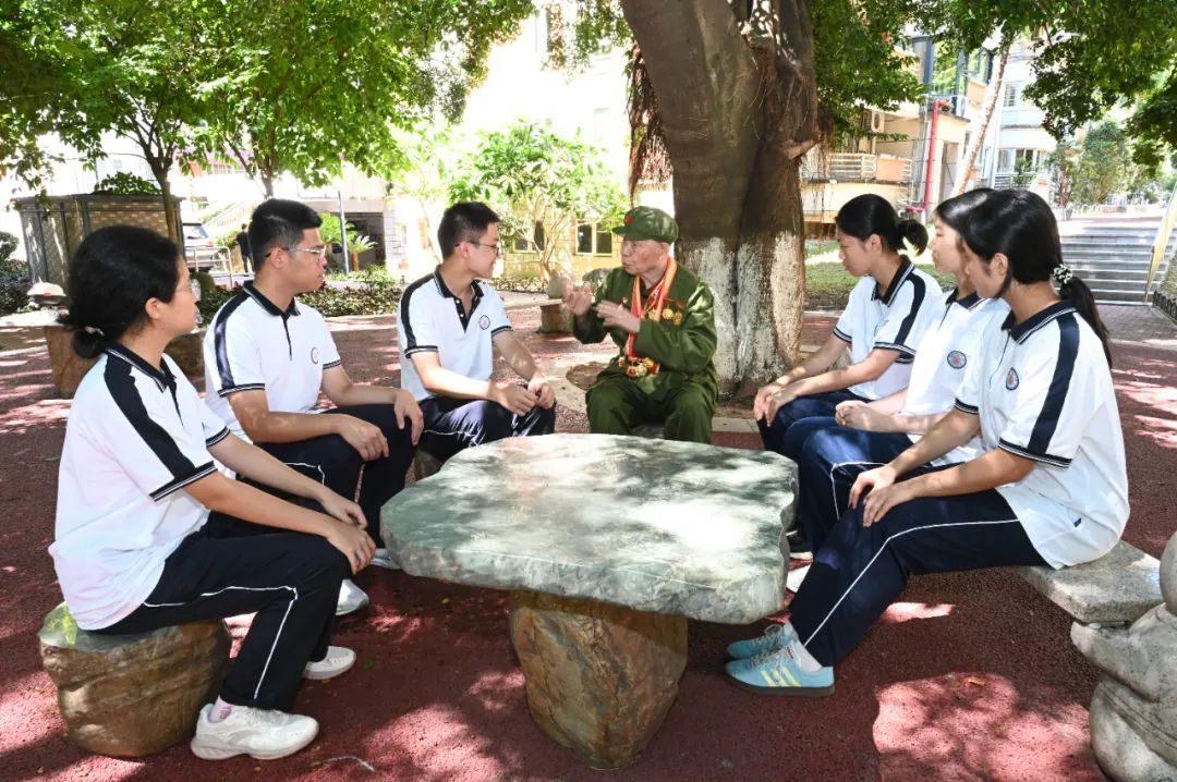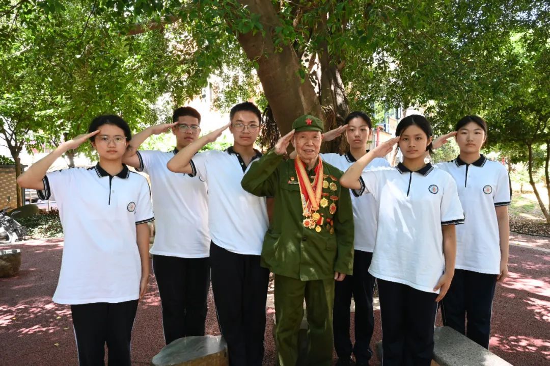 臨別時(shí),老人緊緊握住他們的手,反復(fù)叮囑:“你們要珍惜現(xiàn)在的好時(shí)光,好好學(xué)習(xí),將來(lái)成為國(guó)家的棟梁!”榕樹(shù)下,學(xué)生與老兵用軍禮向革命前輩們致敬。 這場(chǎng)相隔八十年的對(duì)話(huà),不僅是記憶的傳遞,更是一次精神的交接。年輕的目光與滄桑的眼神在此相遇,他們彼此致意,也彼此照亮。