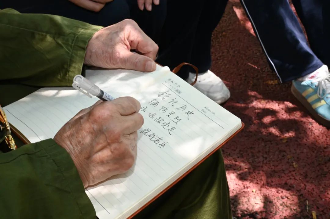 “張爺爺,您當(dāng)時(shí)害怕嗎?”“這枚紀(jì)念章對(duì)您來(lái)說(shuō)意味著什么?”交流中,學(xué)生們踴躍提問(wèn),張老一一回答,并提筆勉勵(lì)大家:“銘記歷史,緬懷先烈,永遠(yuǎn)跟黨走!”寫(xiě)到動(dòng)情處,他忍不住拍了拍學(xué)生的肩頭。
