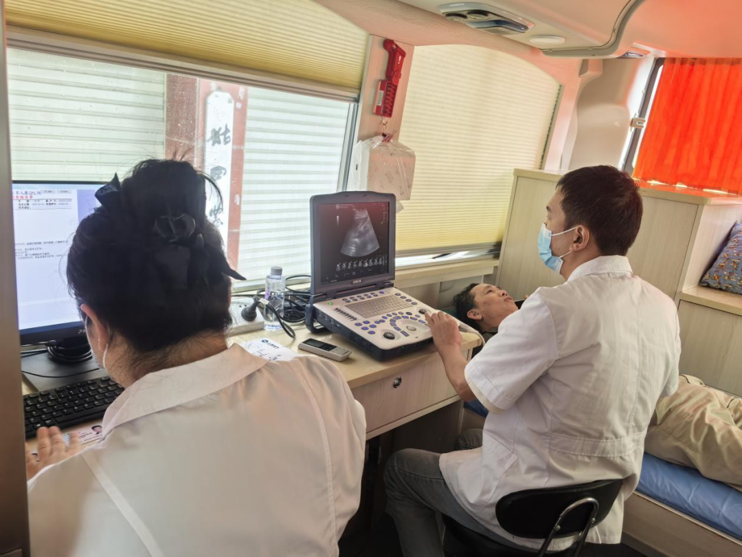 21日,來自姑田鎮的優撫對象正在醫療巡診車上進行腹部彩超檢查